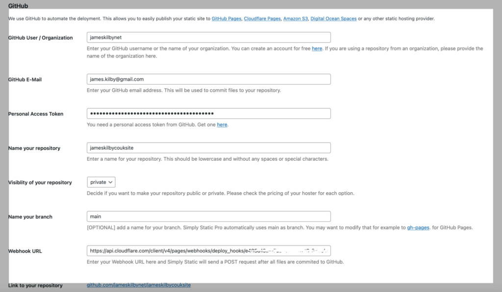 Within GitHub, I have created a repo (Called jameskilbycouksite) I have made this private but it could easily be a public repo. I have then added my personal access token so that SimplyStatic can push to the repo and lastly added a webhook to be called when the site has been updated (More on this a bit later)