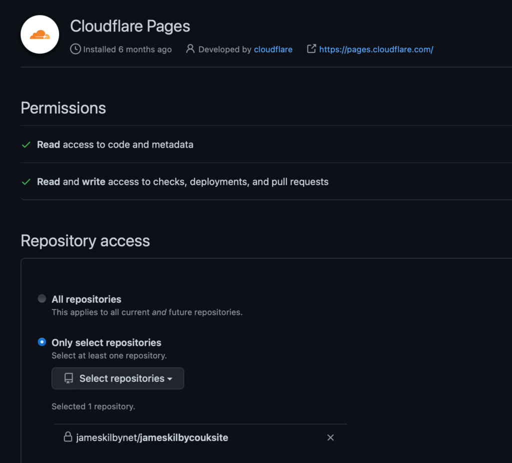 When you are logged into Cloudflare navigate to the pages section and create a project. At this point, I selected connect to Git and login/select the relevant GitHub account and Repo. For this to function, the GitHub Pages application needs to have been given permission in your GitHub Account