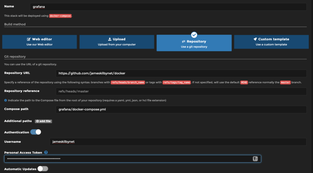 I am using a private repository and therefore need to enable authentication to allow Portainer to access the private repo. This requires a Personal Access Token to be created as documented here.