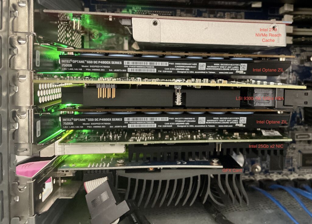 For the ZIL I am using two Intel Optane P4800X 750GB devices in a mirror configuration. I was VERY lucky to get these sample hardware devices from Intel as part of the VMware vExpert program and I have some blogs coming up dedicated to these devices.
