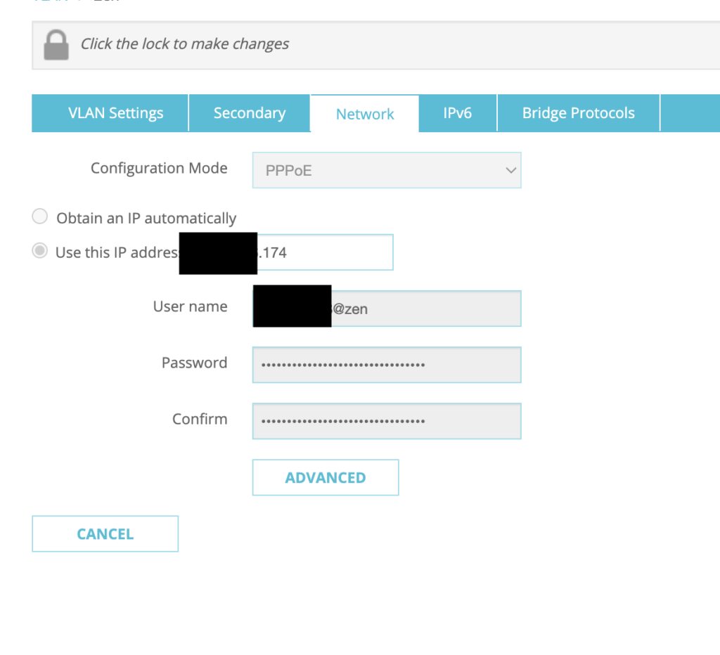 I have a /29 address range from Zen so I add my username and password to the network page together with the router IP. The router IP is the highest of the allocated range so in my case X.X.X.174