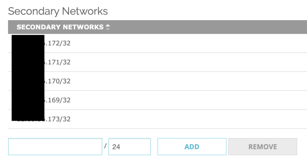 To utilise the other addresses allocated by Zen these are added to the secondary tab as /32’s