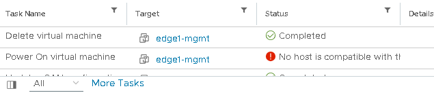 And last of all when the NSX edges attempt to power on they will fail due to the lack of a feature in the CPU called 1G huge page support. These issues can manifest when deploying NSX outside of VCF so a lot has been written about these issues and how to overcome them.