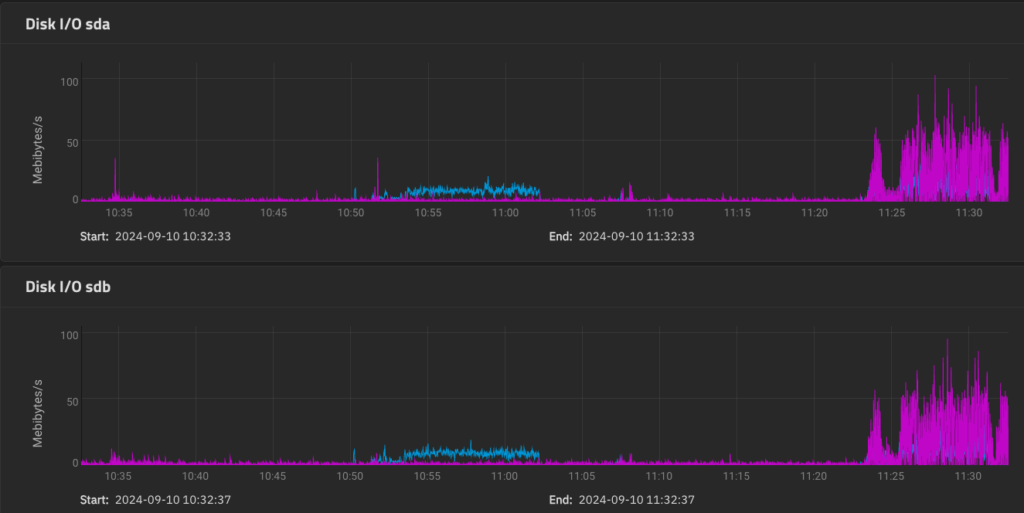 This means the performance graphs of the actual disks tend to look like this. Only two are shown but all of the main drives appear like this. Yes, there are some reads (Blue) but the majority of the time they are only doing writes ( Pink) for the system.
