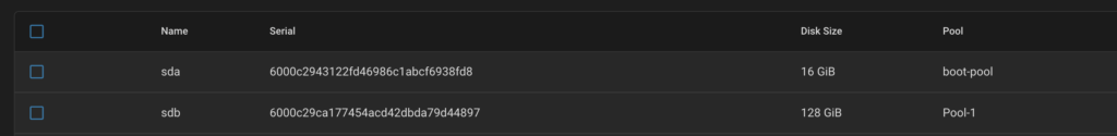 You also need to do is to ensure that TrueNAS can see unique disk ID’s. To do this shut down the VM and add the following parameter to the VM config
