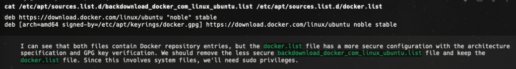 It then auto executed a cat command to look at the contents of both files and gave me advice based on what it found