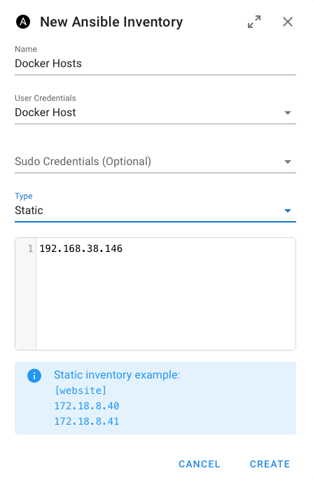 The Inventory specifies hosts to be managed with the appropriate credentials.