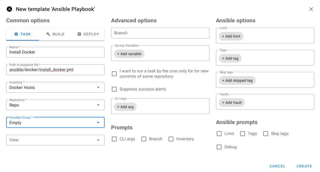 The task templates are the actions that we want Sempahore to perform for us. In the example, I will just be using it to deploy Docker onto host’s specified in the Inventory.