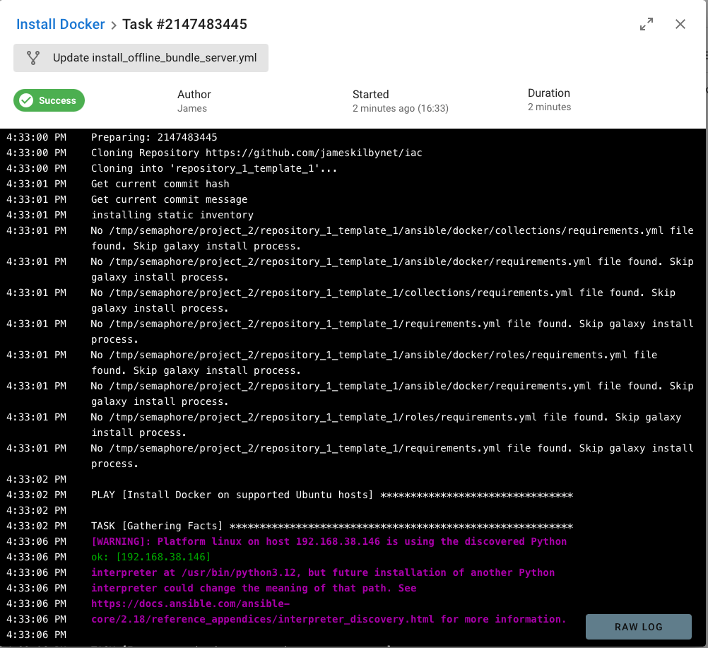 Semaphore will clone the GitHub repo and then start executing the tasks defined in the Ansible playbook as can be seen above. The big green success button at the top tells you that all of the tasks executed successfully.